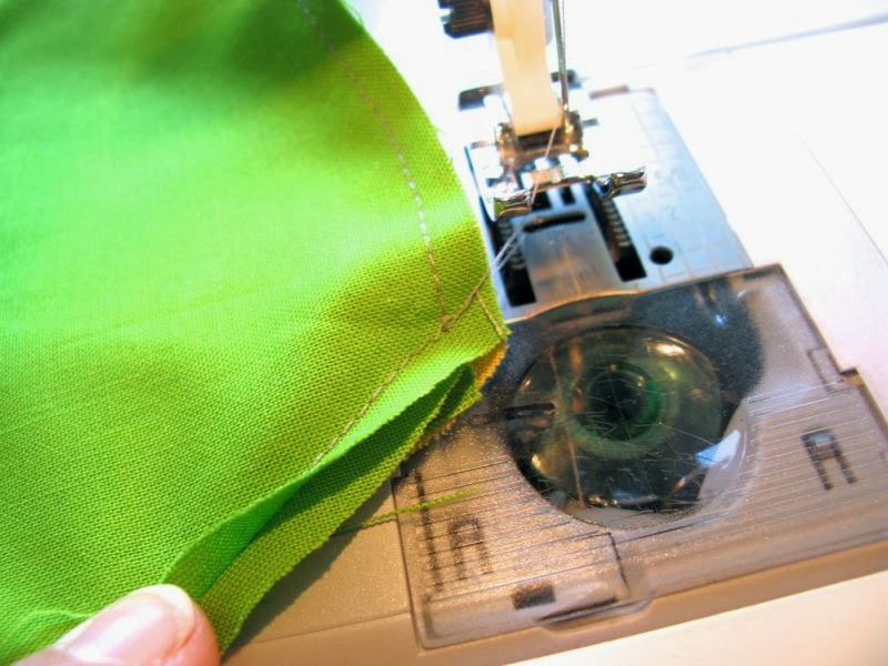 Lift your needle out of the cloth. I pulled it away to show you what I mean, but you don’t need to do that. Just give yourself a little room to smooth the (green) seam allowances out of the way, and to find the place to insert your needle again.