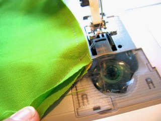 Re-insert your needle just on the other side. Then line up the next two raw edges, smoothing the fabric away from the needle and your presser foot. Sounds more confusing than it is. Take a few tiny stitches to anchor, then change your stitch length back to normal.