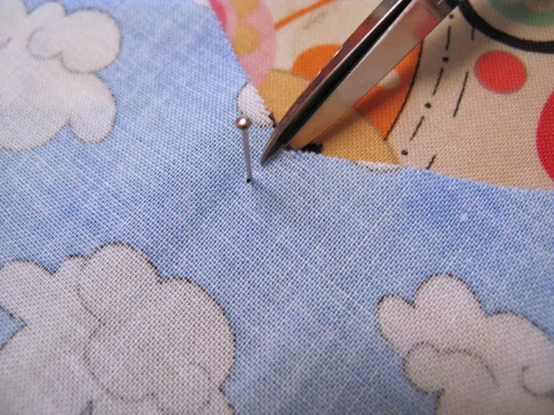 Snip to within a couple of threads of the pin. Leaving the pin there insures that you won’t cut too far. If that happens, curse a little. You can sometime rescue the piece with a bit of fusible interfacing. Better to not cut too far. Half of the seam (1/8″) is all that’s needed.